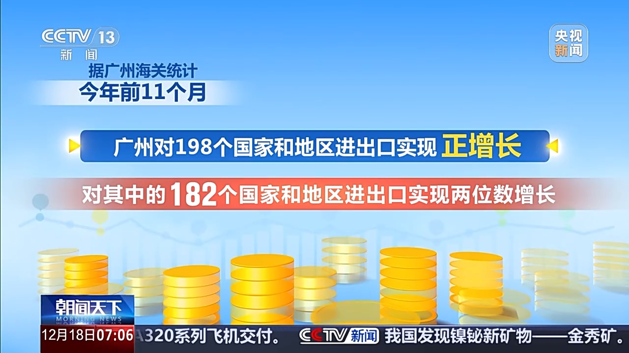 據(jù)廣州海關(guān)統(tǒng)計(jì),今年前11個(gè)月,廣州對(duì)198個(gè)國(guó)家和地區(qū)進(jìn)出口實(shí)現(xiàn)正增長(zhǎng),對(duì)其中的182個(gè)國(guó)家和地區(qū)進(jìn)出口實(shí)現(xiàn)兩位數(shù)增長(zhǎng)。