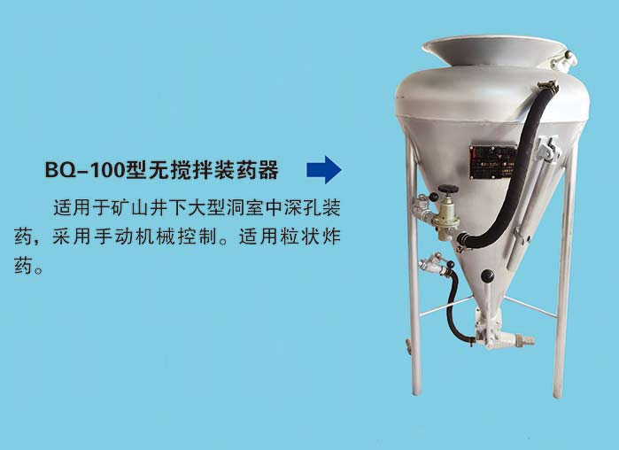 BQ-100型抬杠式無攪拌裝藥器,適用于礦山井下大型洞室中深孔裝藥,采用手動機(jī)械控制。適用粒狀炸藥。