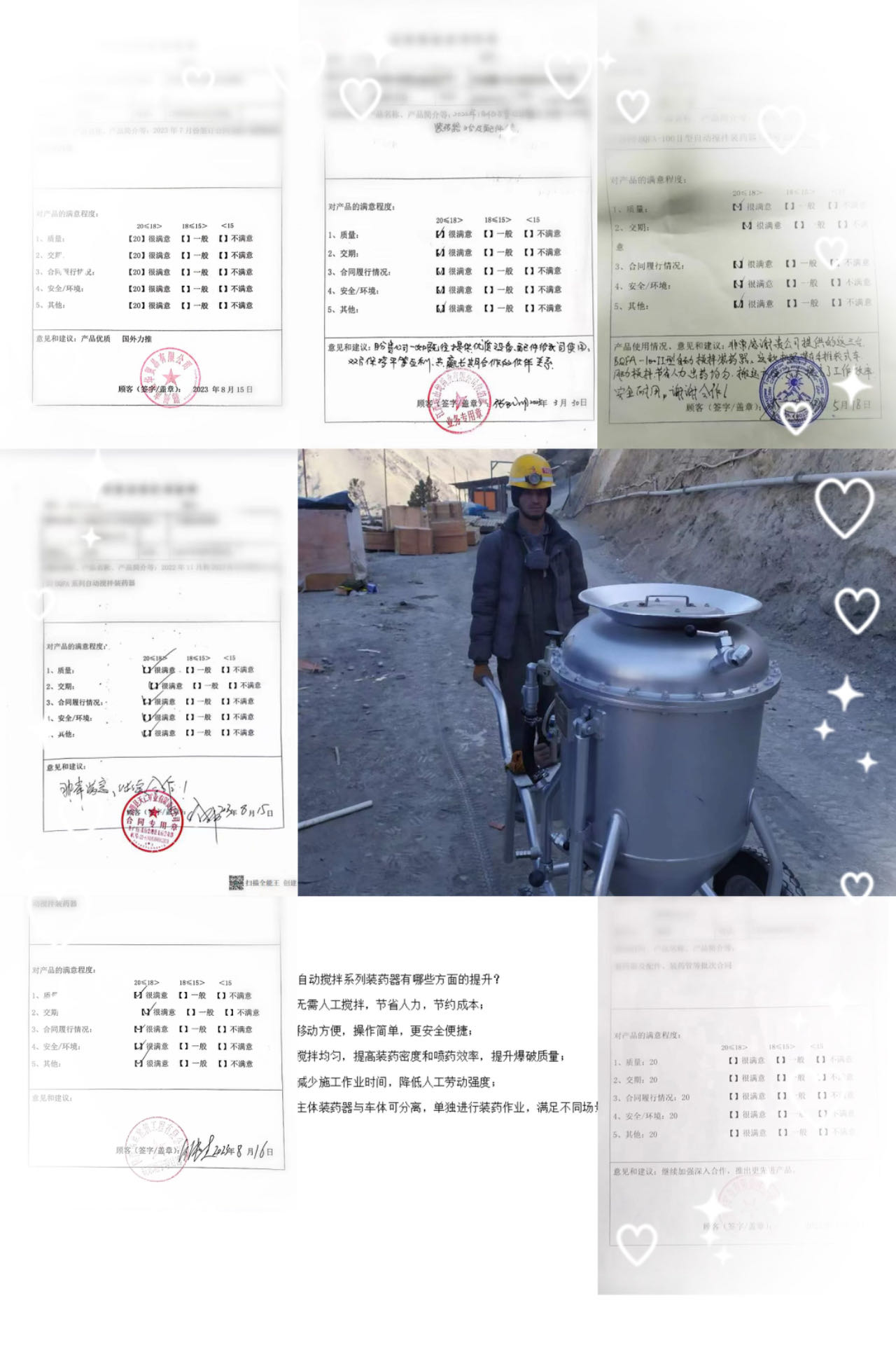 BQFA型自動攪拌系列裝藥器,與人工攪拌相比,無需人工攪拌,節(jié)省人力且攪拌均勻,移動方便,操作簡單便捷,大大降低人工勞動強度,提高裝藥密度、爆破質(zhì)量,減少施工作業(yè)時間。先后出口塔吉克斯坦、老撾,秘魯,尼日利亞、法國等國家,使用情況反饋中得到一致好評并大力推薦。