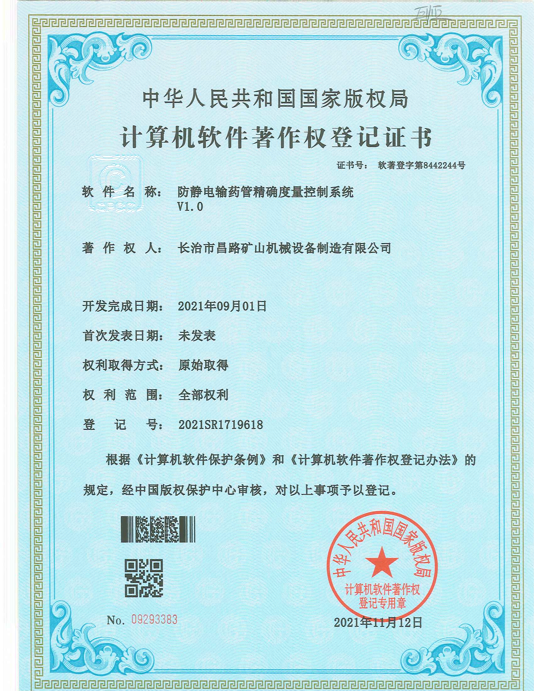 防靜電輸藥管精確量控制系統(tǒng)著作權登記證書