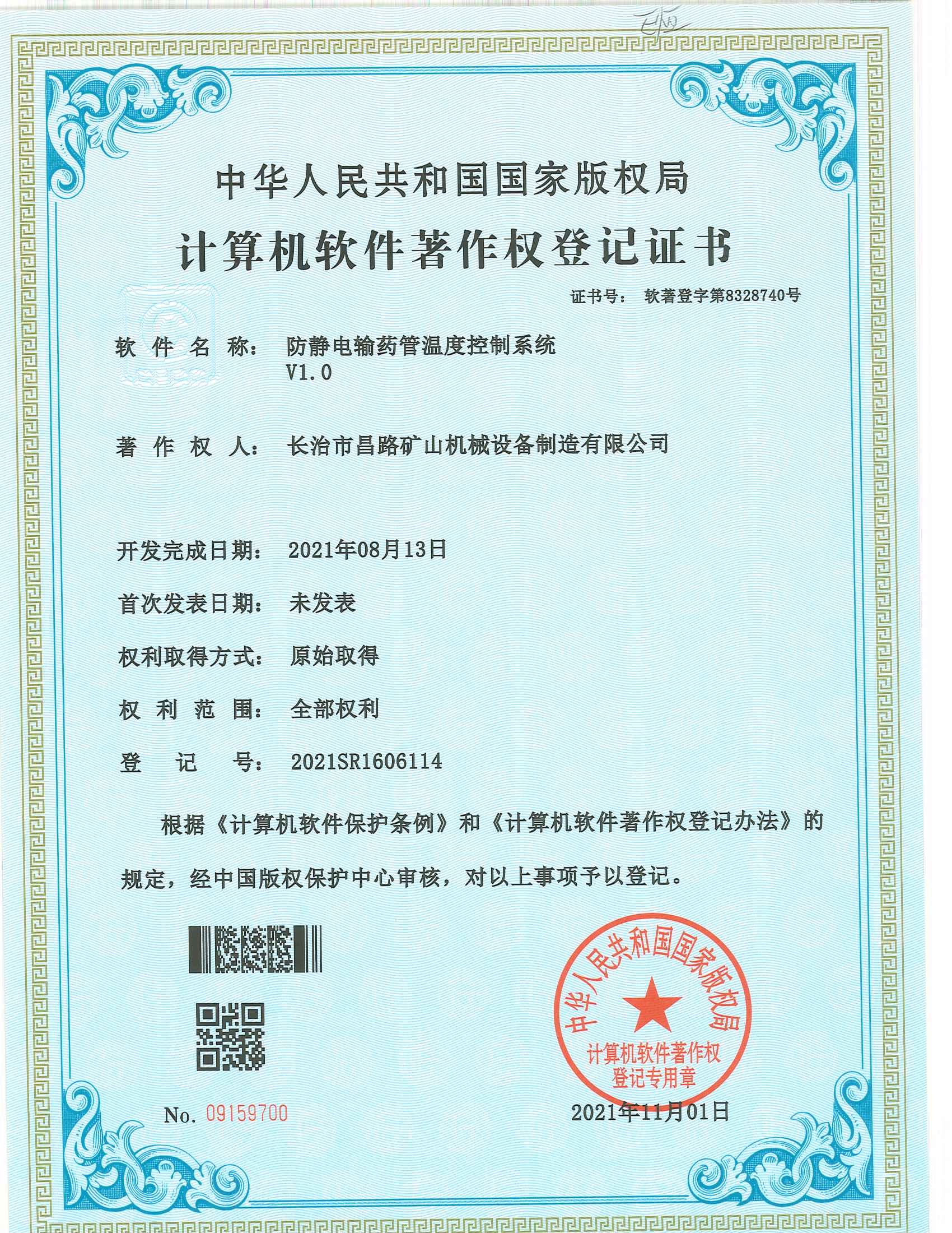 防靜電輸藥管溫度控制系統(tǒng)著作權登記證書