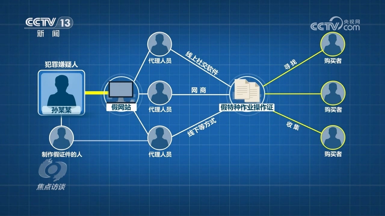 據(jù)介紹,犯罪嫌疑人孫某某是最上游,他首先花錢雇人制作了假網(wǎng)站,然后發(fā)展多名代理人員,代理通過(guò)線上社交軟件、網(wǎng)商和線下等方式,尋找、收集花錢購(gòu)買假的特種作業(yè)操作證的人員。由專門負(fù)責(zé)制作假證件的人,制作好假證,發(fā)送給相應(yīng)的下線代理人員,最后到購(gòu)買者手里。