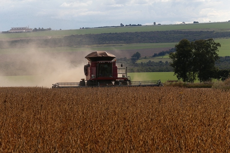 4月12日,在巴西戈亞斯州班德里尼亞農場,農機進行收獲大豆作業(yè)。新華社發(fā)(盧西奧·塔沃拉攝)
