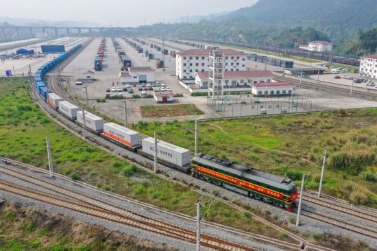 2023年4月3日,陸海新通道跨境鐵公聯(lián)運(yùn)班列(重慶—瑞麗—緬甸)首發(fā)班列在重慶江津小南埡鐵路物流中心發(fā)車(無(wú)人機(jī)照片)。新華社記者 唐奕 攝