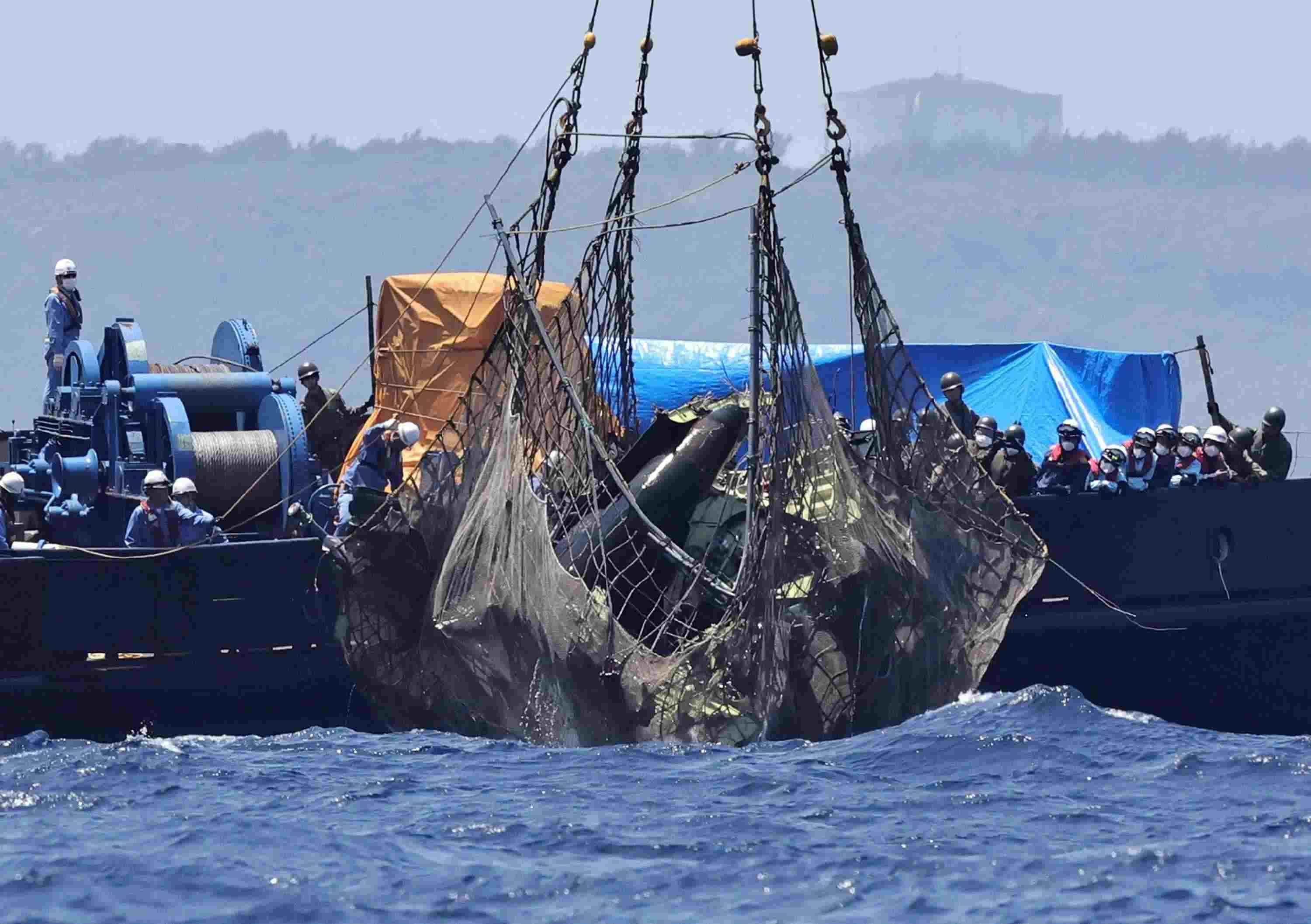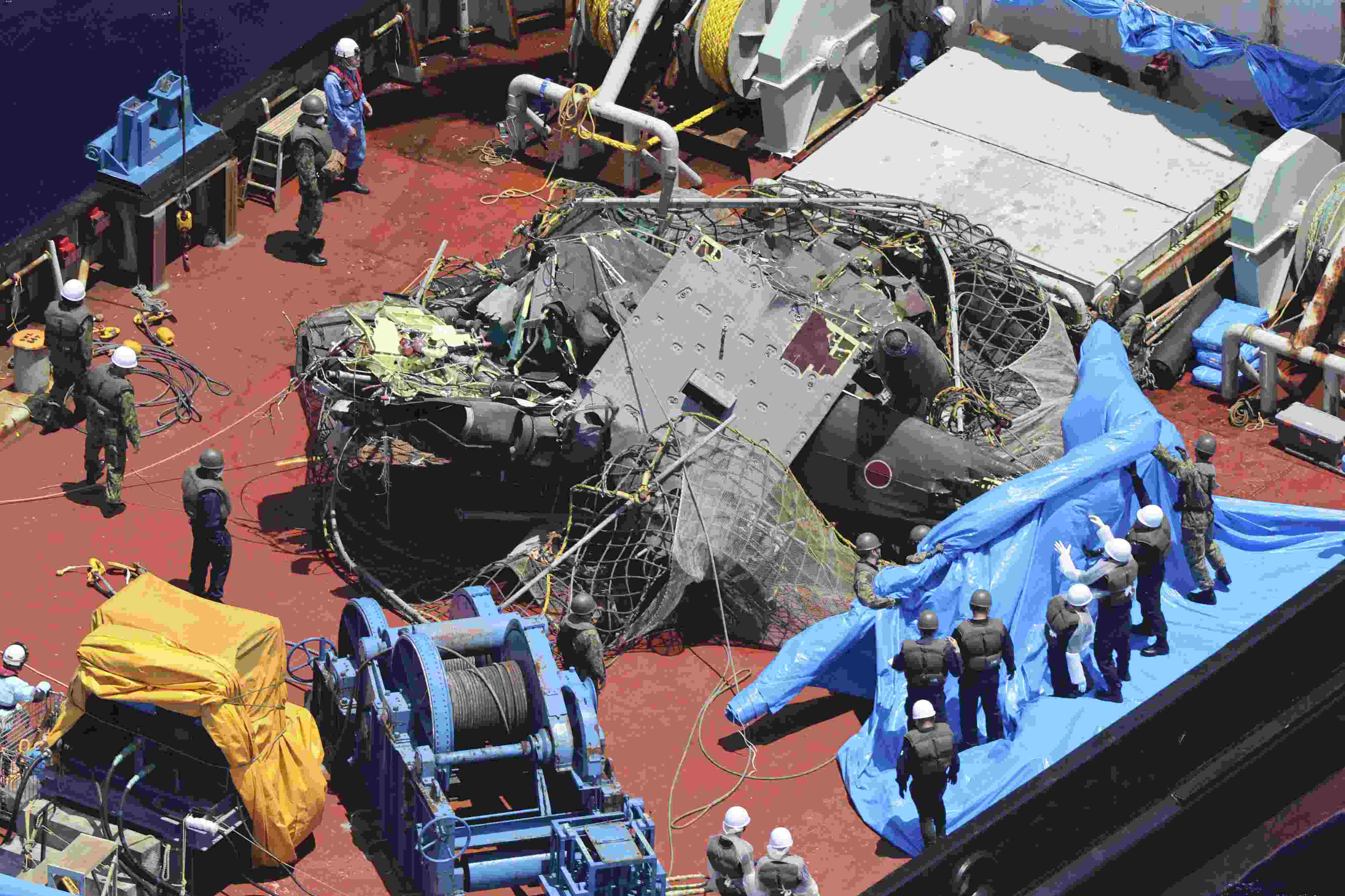 當?shù)貢r間2023年5月2日,日本民間作業(yè)船于當?shù)貢r間上午11時45分左右,將沖繩縣宮古島附近失事的日本自衛(wèi)隊直升機的機體打撈出海。據(jù)悉,一架日本陸上自衛(wèi)隊直升機4月6日在沖繩縣宮古島附近海域失聯(lián),失事直升機上共載有10人。 視覺中國