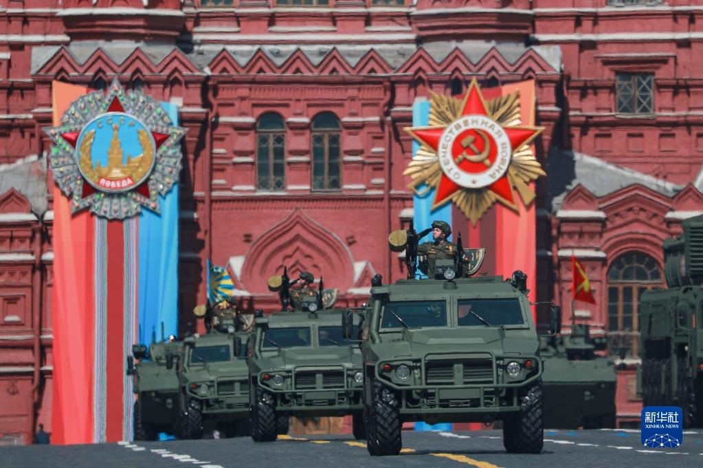 5月9日,在俄羅斯首都莫斯科,軍車編隊駛過紅場。   新華社記者 曹陽 攝