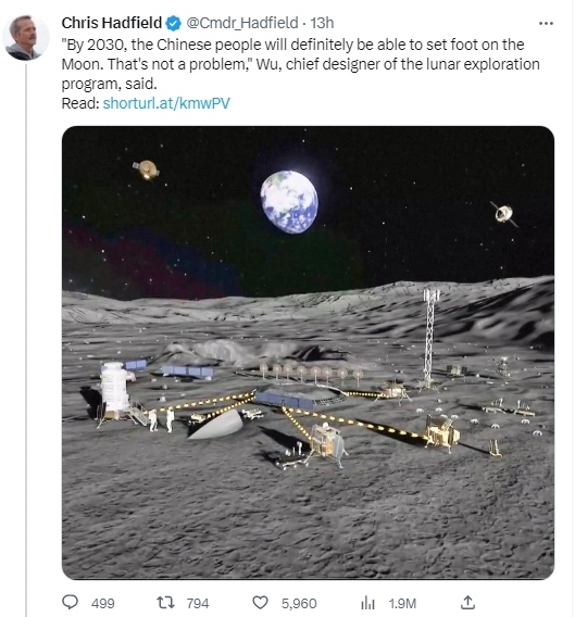 據(jù)報(bào)道,加拿大航天局前宇航員克里斯·哈德菲爾德在社交媒體推特上轉(zhuǎn)發(fā)了CGTN的一篇報(bào)道,他同時(shí)寫道,“中國(guó)探月工程總設(shè)計(jì)師吳偉仁說,‘到2030年,中國(guó)人的足跡一定能夠踏上月球。這不是個(gè)問題。’”