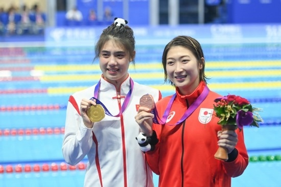 9月29日,冠軍中國選手張雨霏(左)和季軍日本選手池江璃花子在杭州亞運(yùn)會游泳項(xiàng)目女子50米蝶泳頒獎(jiǎng)儀式后。新華社記者 黃宗治 攝