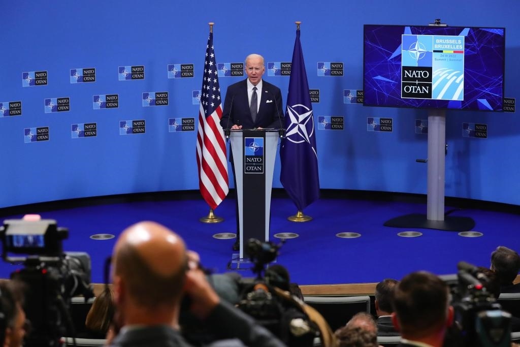 ?2022年3月24日,美國總統(tǒng)拜登在比利時(shí)布魯塞爾的北約總部出席北約特別峰會后的新聞發(fā)布會。新華社記者鄭煥松攝