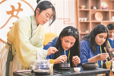 2024年4月15日,2024年“漢語橋”上海合作組織國家青年學(xué)生春令營開營儀式在新疆師范大學(xué)舉行。來自8個上合組織國家的近500名青年學(xué)生參加了此次春令營。圖為參加春令營的來華青年學(xué)生在新疆師范大學(xué)學(xué)生(左)的指導(dǎo)下學(xué)習(xí)茶藝。