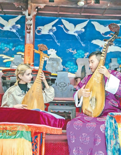 來(lái)自伊朗的游客在云南麗江大研納西古樂(lè)會(huì)學(xué)習(xí)古樂(lè)演奏。