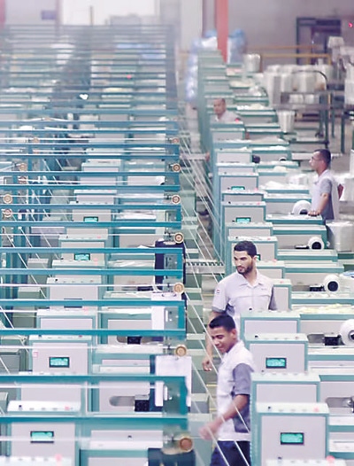 工作人員在巨石埃及玻璃纖維生產(chǎn)基地絡(luò)紗車間操作設(shè)備。