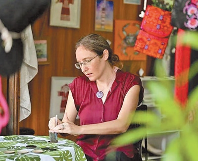 謝敏來自美國芝加哥,曾是一名英語老師的她,如今稱自己為設(shè)計師、小店店主。謝敏的小店叫“海島樂趣”,位于海南??诎咨抽T公園內(nèi)?!斑@是五指山市的黎錦手提包,這是保亭村子里的織品,那幾件是東方市的。”店里擺放的黎錦作品出自海南各地村民之手,謝敏如數(shù)家珍。店中還有不少她親手設(shè)計和制作的文創(chuàng)產(chǎn)品,靈感都來自魚、烏龜、閃電等傳統(tǒng)黎錦紋樣。