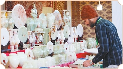 參觀者在雅礱物交會上選購尼泊爾手工茶壺墊。