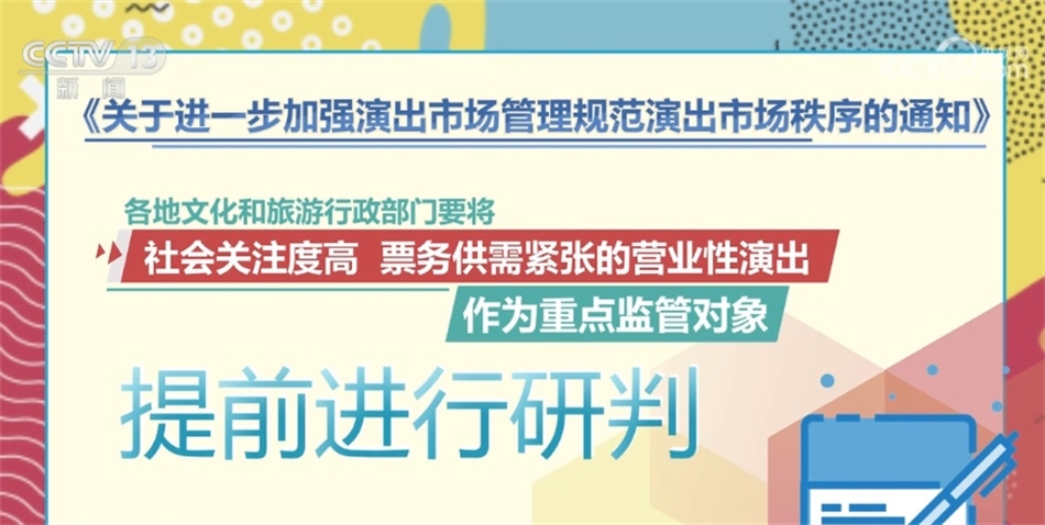通知指出,各地文化和旅游行政部門要依法做好演出活動的審批工作,將屬于營業(yè)性演出范圍的農(nóng)村集鎮(zhèn)演出、流動性演出納入審批管理,嚴格審核演出舉辦單位的資質(zhì)文件,統(tǒng)一審批要求,做好內(nèi)容監(jiān)管。對不符合法定審批要求的,堅決不予批準。文化和旅游行政部門要定期對演出場所進行檢查,督促演出場所定期開展設(shè)施設(shè)備檢查,落實安全生產(chǎn)責任制。督促演出場所建立完善現(xiàn)場巡查制度,指定專人負責演出活動的巡查,做好現(xiàn)場觀眾管理,堅決防止擁擠、踩踏等事故發(fā)生,確保演出現(xiàn)場安全。各地文化和旅游行政部門要將社會關(guān)注度高、票務(wù)供需緊張的營業(yè)性演出作為重點監(jiān)管對象,提前進行研判。督促演出舉辦單位、演出票務(wù)經(jīng)營單位面向市場公開銷售的營業(yè)性演出門票數(shù)量,不得低于核準觀眾數(shù)量的70%。對在票務(wù)經(jīng)營中發(fā)現(xiàn)有炒票問題或可能造成不良影響的,應(yīng)當及時約談演出舉辦單位和演出票務(wù)經(jīng)營單位,督促整改。要聯(lián)合屬地公安、市場監(jiān)管等部門,依法打擊“黃?!背雌薄⑻摷傩麄鞯冗`法違規(guī)行為,切實保障消費者合法權(quán)益。