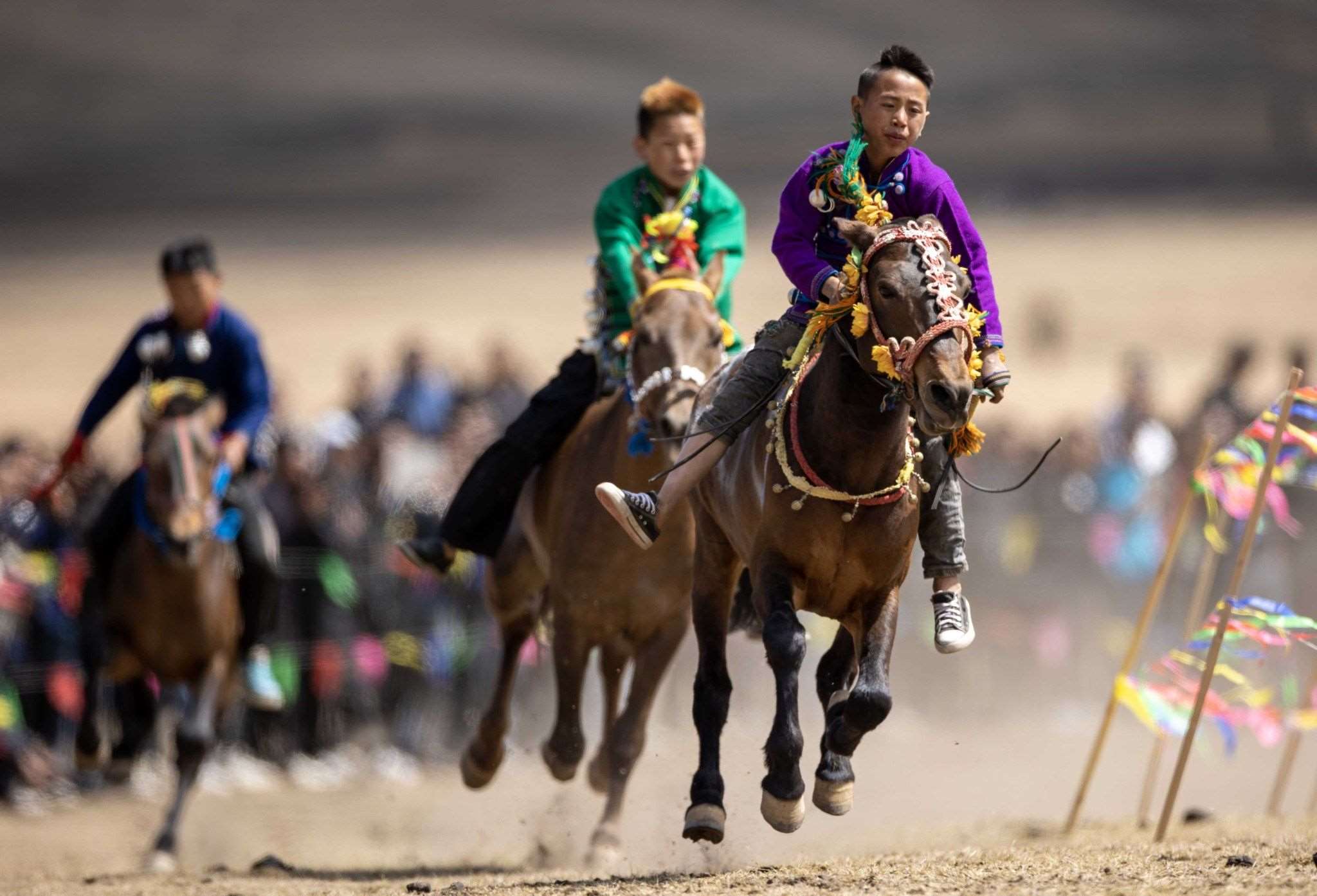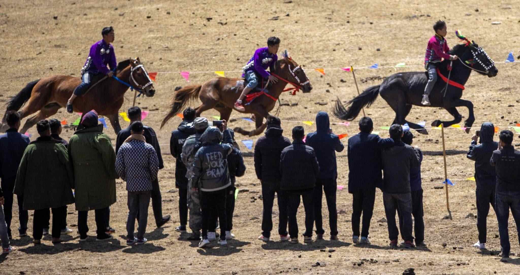 2023年4月25日,四川涼山,普格縣黎安鄉(xiāng)??诹鹤樱瑐鹘y(tǒng)的彝族賽馬比賽拉來(lái)帷幕。視覺(jué)中國(guó)