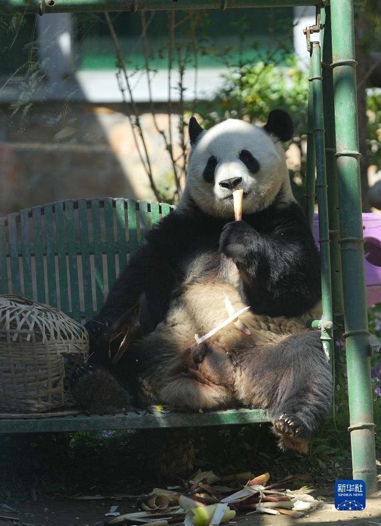 4月30日,在北京動物園大熊貓館,大熊貓“萌蘭”在吃竹筍。