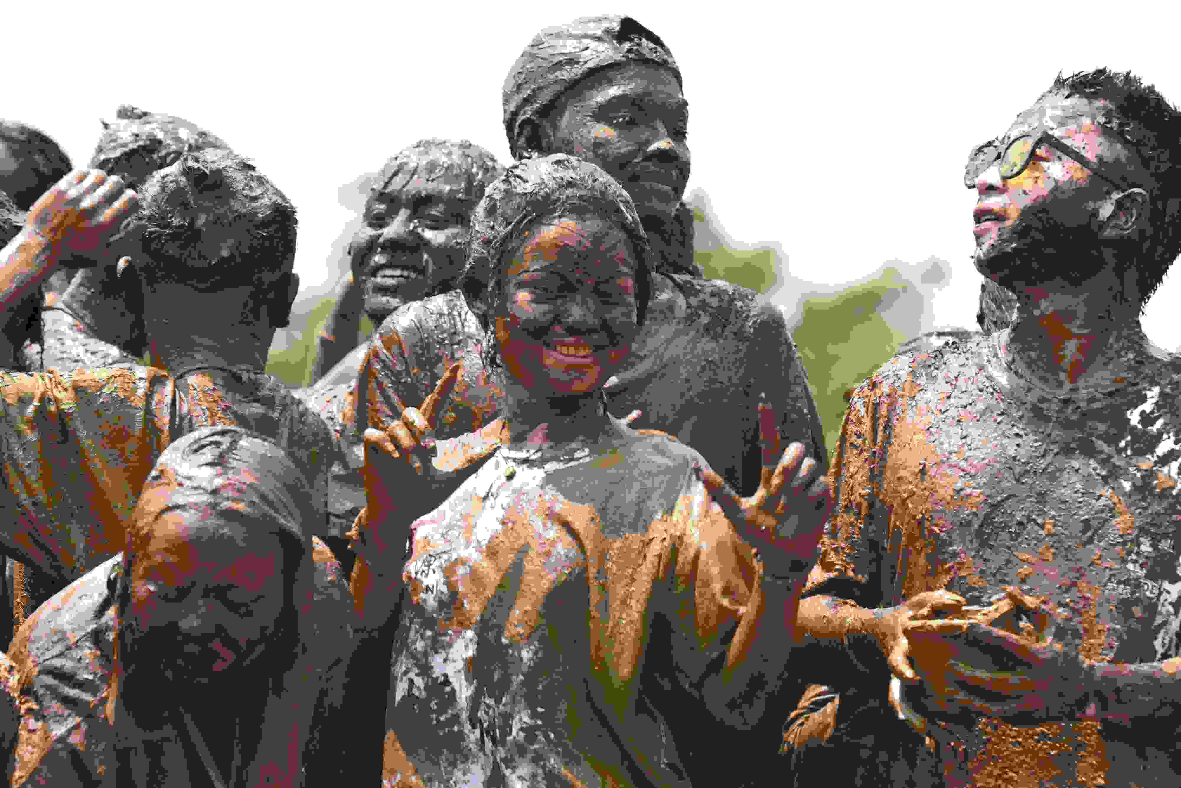 2023年4月30日,云南臨滄,游客相互抹泥表示祝福。當(dāng)日,2023年中國(guó)佤族司崗里摸你黑狂歡節(jié)在云南省臨滄市滄源佤族自治縣啟幕。人們用天然原料“娘布洛”配置而成的涂料相互涂抹表示祝福,摸得越黑,代表快樂(lè)幸福越長(zhǎng)久。 視覺(jué)中國(guó)
