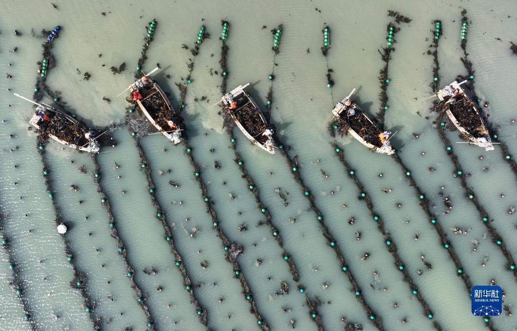 5月8日,在山東省榮成市愛(ài)倫灣海域海帶養(yǎng)殖區(qū),漁民采收海帶(無(wú)人機(jī)照片)。