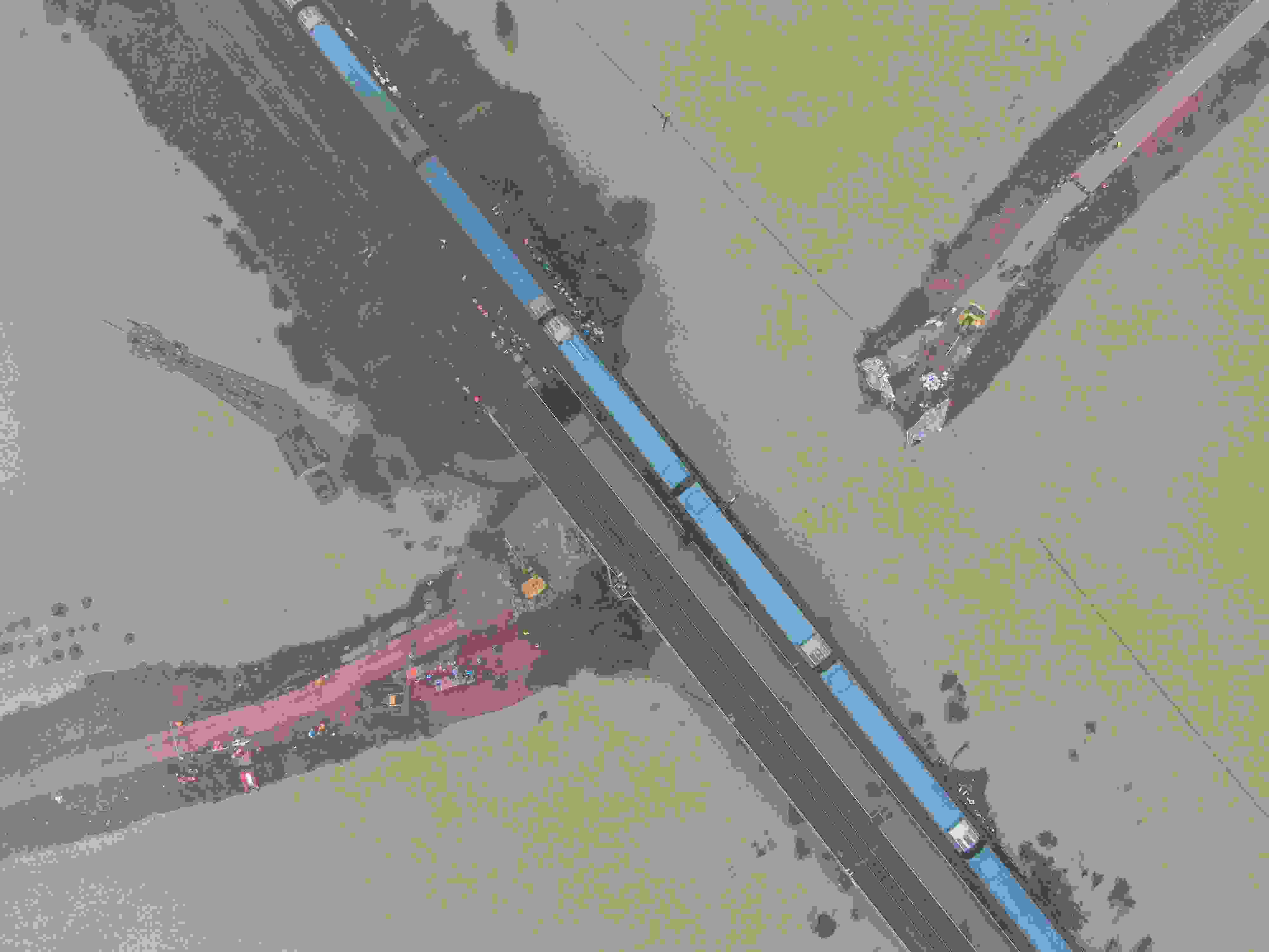 2023年5月6日,江西宜春,航拍清豐堤河堤潰口現(xiàn)場,一列火車從潰口上方的鐵路橋上經(jīng)過,橋下的救援隊(duì)伍正在開展搶險(xiǎn)救援工作。 視覺中國