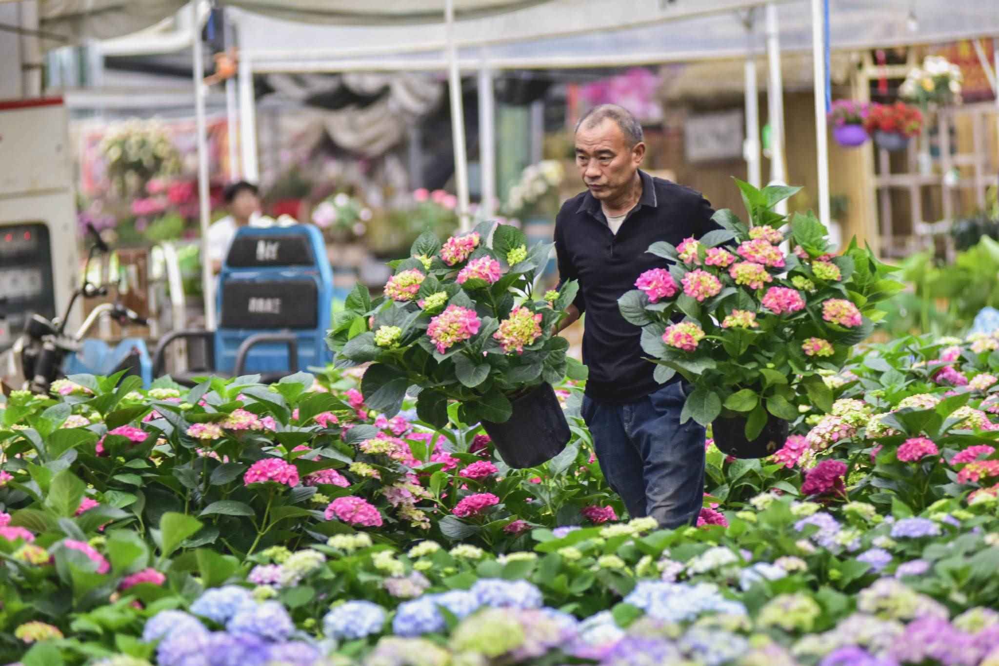 隨著母親節(jié)臨近,山東省青州市花卉苗木交易中心生意紅火起來(lái),色彩艷麗且寓意吉祥的康乃馨、繡球、長(zhǎng)壽花等受到消費(fèi)者青睞。視覺(jué)中國(guó)
