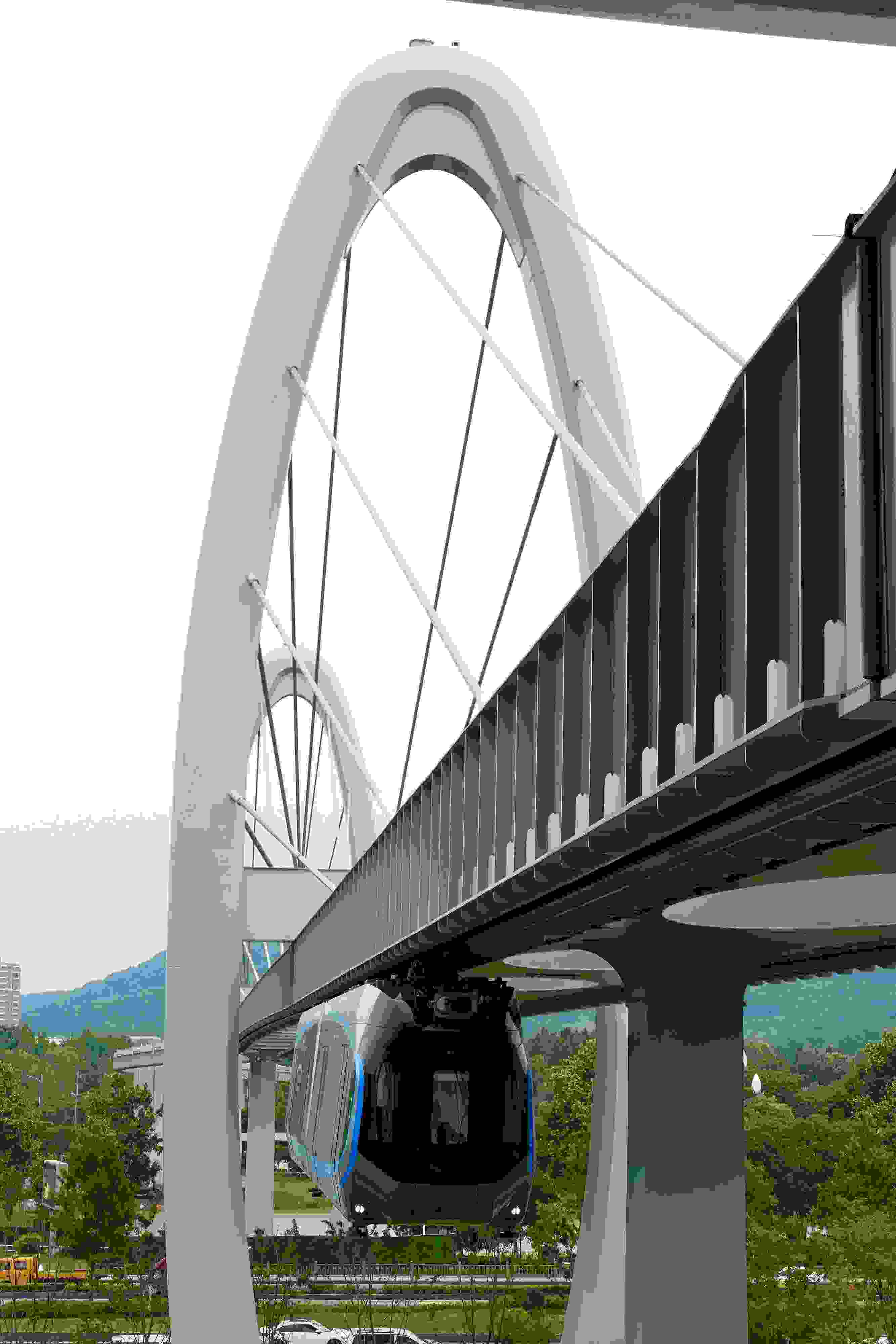 2023年5月11日,武漢,光谷空軌旅游線項(xiàng)目“光谷光子號(hào)”空中軌道列車(chē)在東湖高新區(qū)試跑。武漢光谷空軌旅游線項(xiàng)目位于武漢市東湖高新區(qū)光谷中央生態(tài)大走廊內(nèi),是生態(tài)大走廊旅游配套基礎(chǔ)設(shè)施之一。其規(guī)劃總長(zhǎng)26.7公里,先行建設(shè)的一期工程長(zhǎng)約10.5公里,設(shè)車(chē)站6座。 視覺(jué)中國(guó)