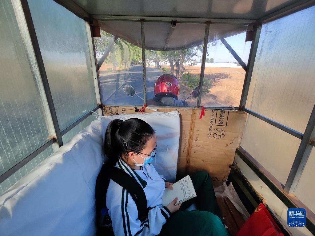 清晨,張連琴騎著電動三輪車?yán)畠豪铌總トド蠈W(xué),女兒在車棚內(nèi)背誦詩詞(5月8日手機拍攝)。