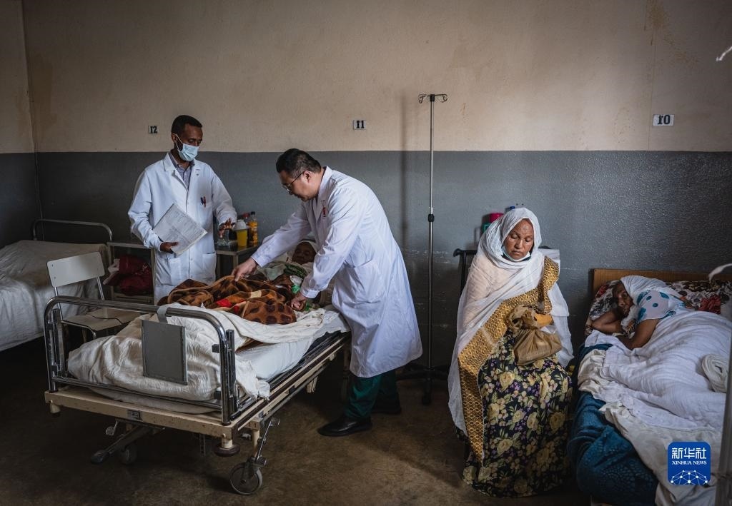 5月9日,在厄立特里亞首都阿斯馬拉的哈利貝特醫(yī)院,醫(yī)療隊普外科醫(yī)生邢宏彬(中)為患者做檢查。