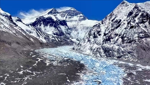 珠峰是“冰川家族聚集地”,廣泛分布著各類冰川。在珠峰北坡,純凈藍(lán)天下,絨布冰川于群峰間蜿蜒而下,晶瑩的冰塔錯(cuò)落有致,壯麗奇幻。