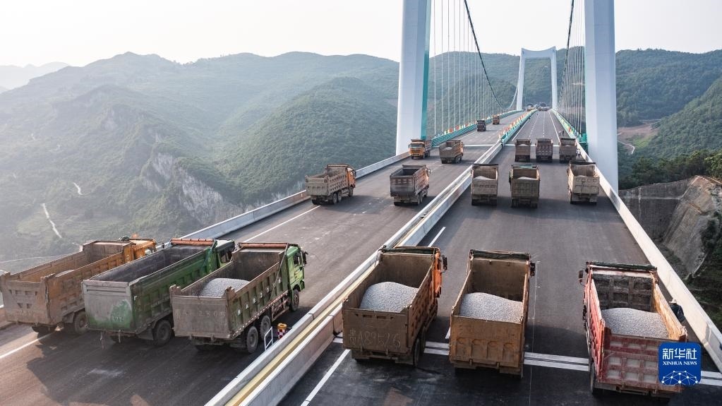 當(dāng)日,由貴州路橋集團(tuán)承建的金烽烏江大橋進(jìn)行靜態(tài)荷載試驗(yàn),48輛負(fù)載砂石的大型貨車有序行駛到固定的位置進(jìn)行對稱、偏心檢測,檢驗(yàn)橋梁結(jié)構(gòu)整體的施工質(zhì)量與受力性能,為橋梁竣工驗(yàn)收提供科學(xué)依據(jù)。