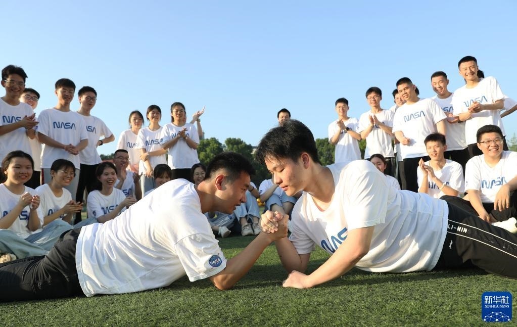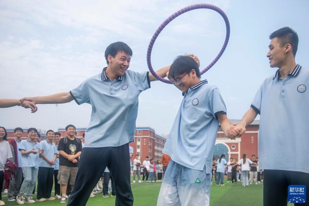 5月25日,在湖南省永州市道縣道州玉潭(東陽)學(xué)校,高三學(xué)生在操場上做減壓趣味活動。   新華社發(fā)(蔣克青攝)