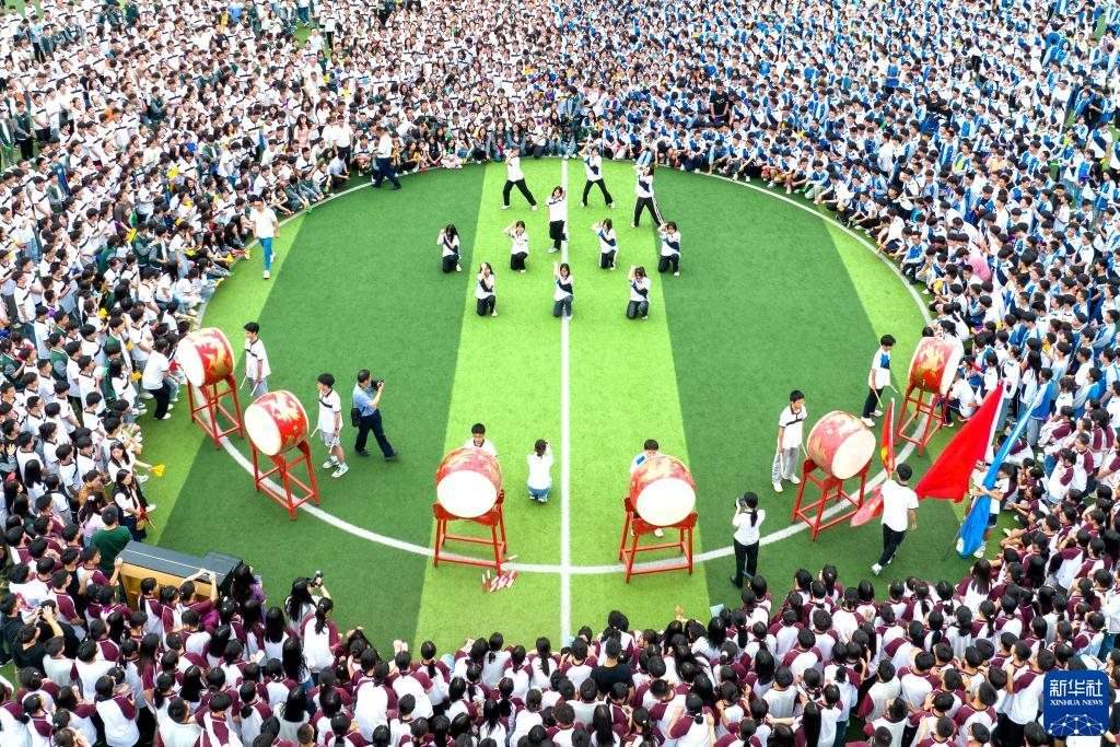 5月29日,湖北省宣恩縣第一高級中學(xué)學(xué)生在快閃活動中表演鼓舞(無人機(jī)照片)。   新華社發(fā)(陶沙攝)