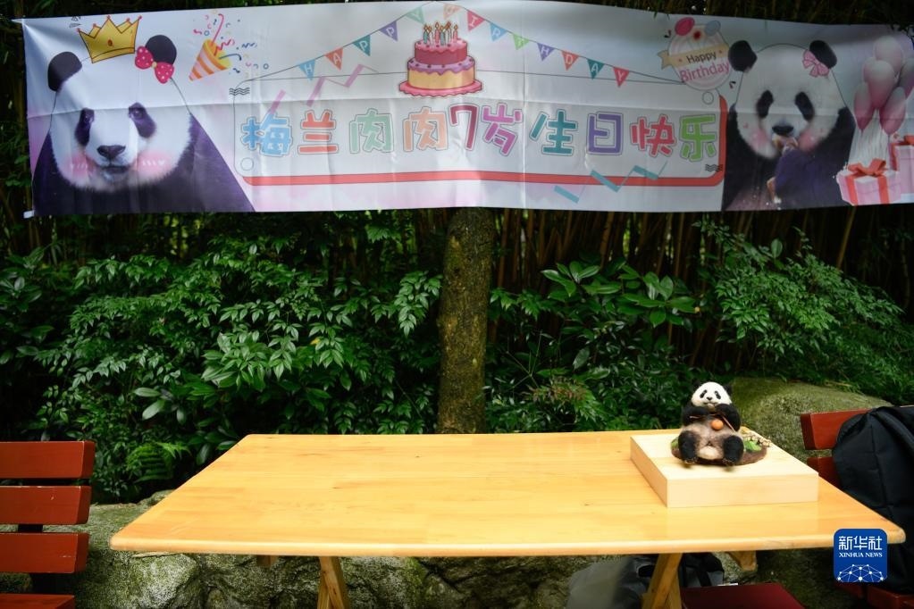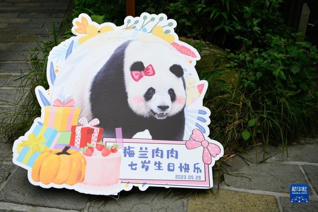 這是5月29日在成都大熊貓繁育研究基地都江堰野放繁育研究中心拍攝的市民為梅蘭布置的生日裝飾。