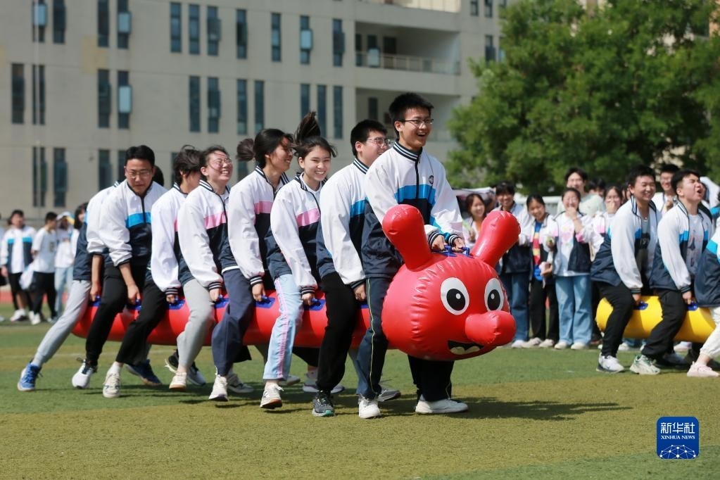 高考臨近,安徽省淮北市第十二中學(xué)組織高三年級(jí)學(xué)生開展豐富多彩的集體減壓活動(dòng),讓學(xué)生們在趣味游戲中釋放壓力,以輕松、樂觀、自信的心態(tài)迎接高考。新華社發(fā)(萬善朝 攝)