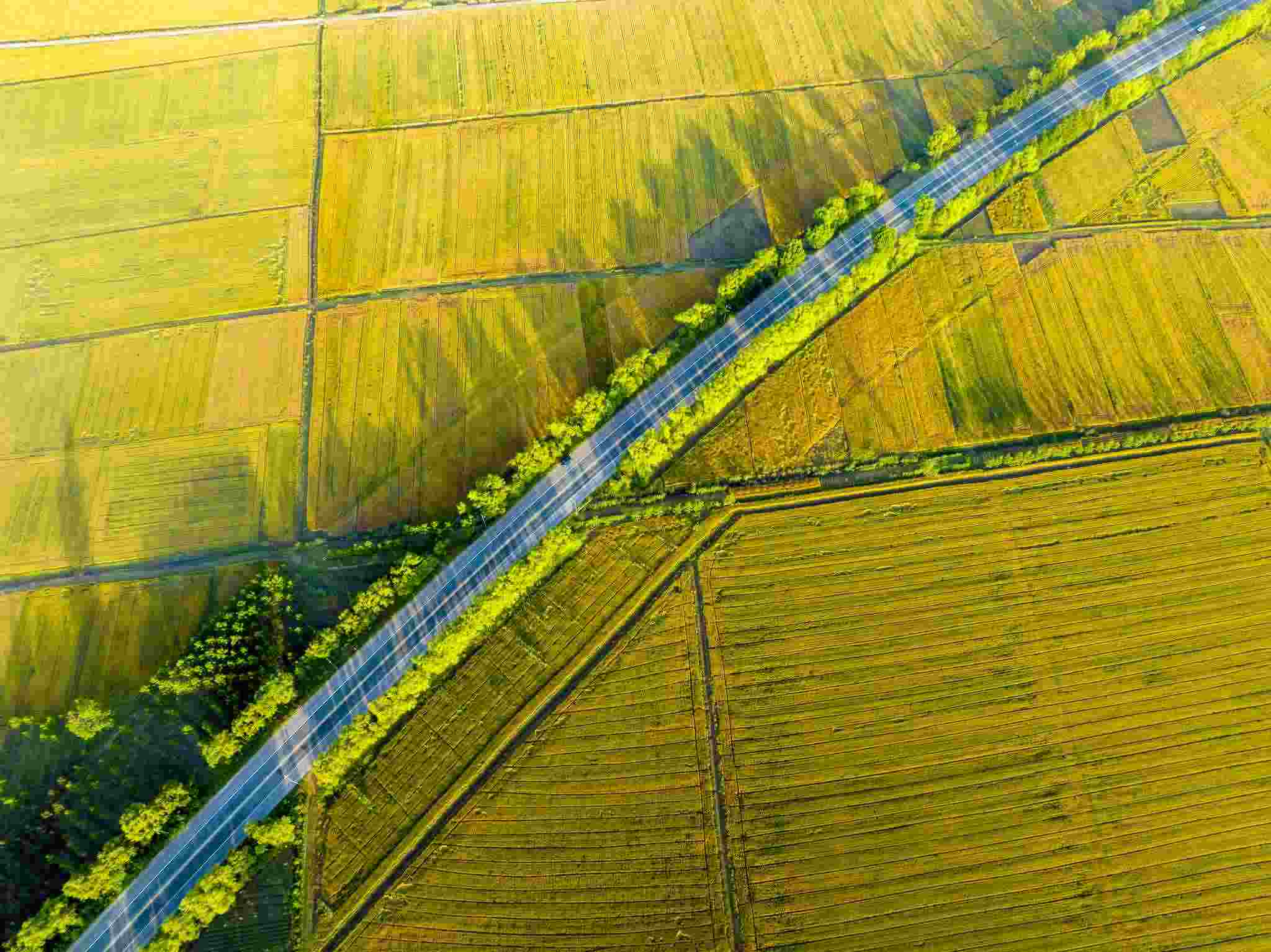 2023年6月3日,江蘇連云港,東海縣,金色田野與村莊、道路、河流共同構(gòu)成了一幅秀美的夏日豐收畫卷。視覺中國