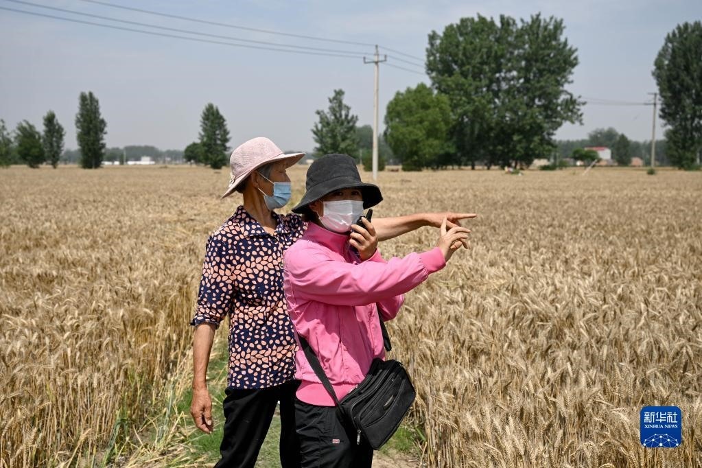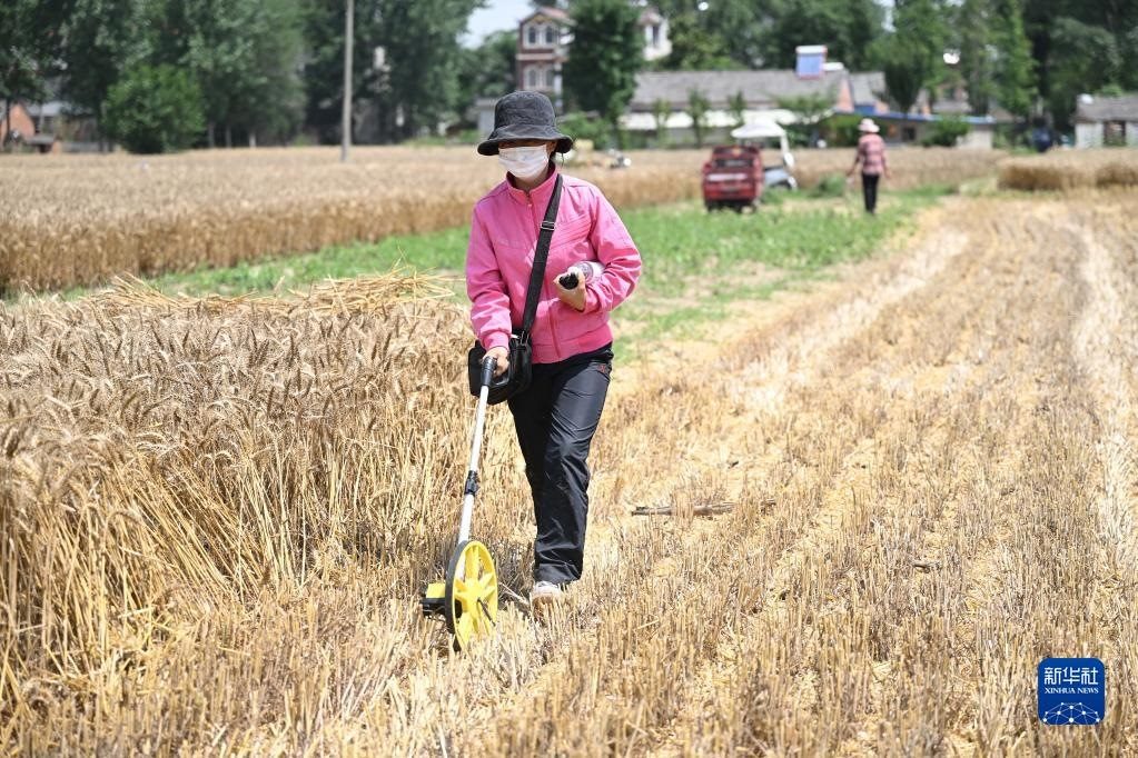 6月2日,在安徽省阜陽市阜南縣許堂鄉(xiāng)劉崗村,陳麗娟使用農田測畝儀測量麥田的面積。   新華社記者黃博涵攝