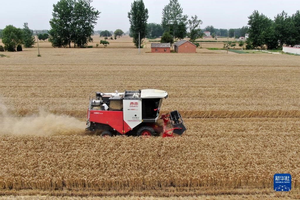 6月2日,在安徽省阜陽市阜南縣許堂鄉(xiāng)劉崗村,董斐斐駕駛收割機為村民收割小麥(無人機照片)。   新華社記者金劍攝
