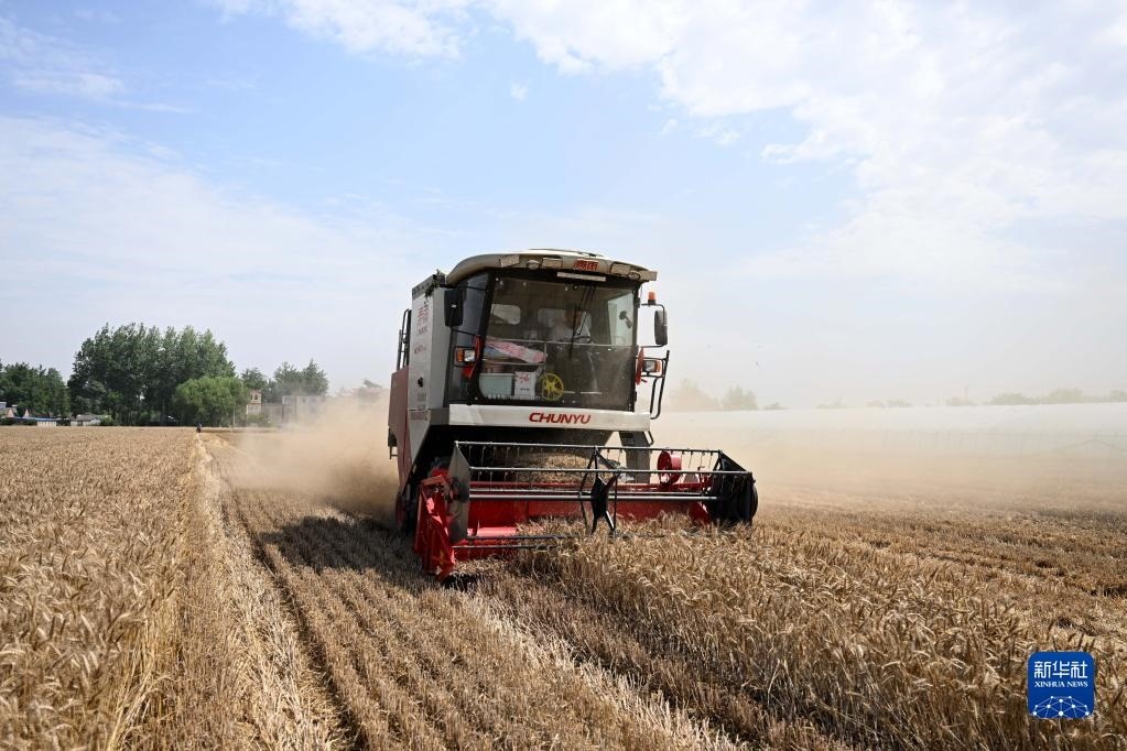 6月2日,在安徽省阜陽市阜南縣許堂鄉(xiāng)劉崗村,董斐斐駕駛收割機為村民收割小麥。   新華社記者黃博涵攝
