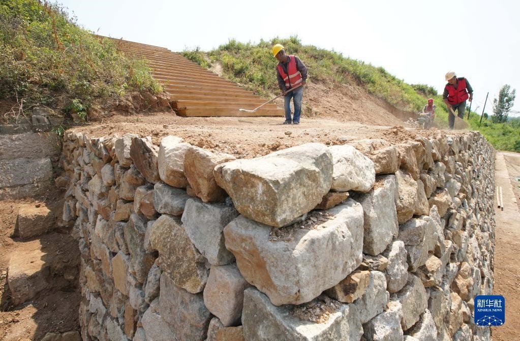 6月16日,工人在山海關(guān)長(zhǎng)城51號(hào)墻臺(tái)馬道修繕工地施工。