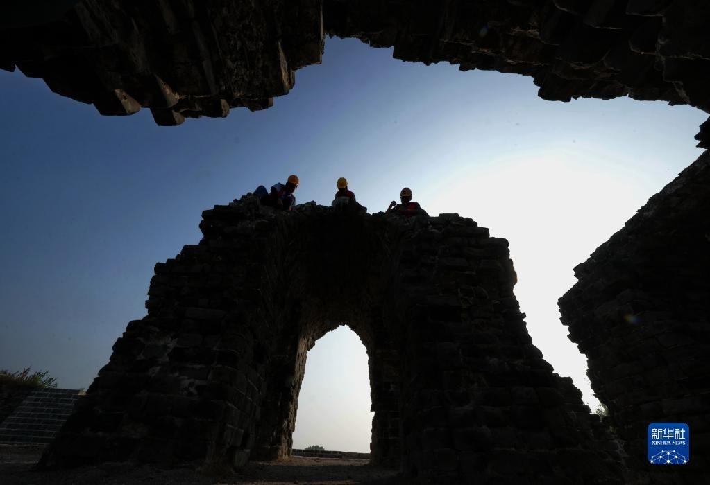 6月15日,工人在山海關(guān)長(zhǎng)城腰鋪9號(hào)敵臺(tái)修繕工地施工。