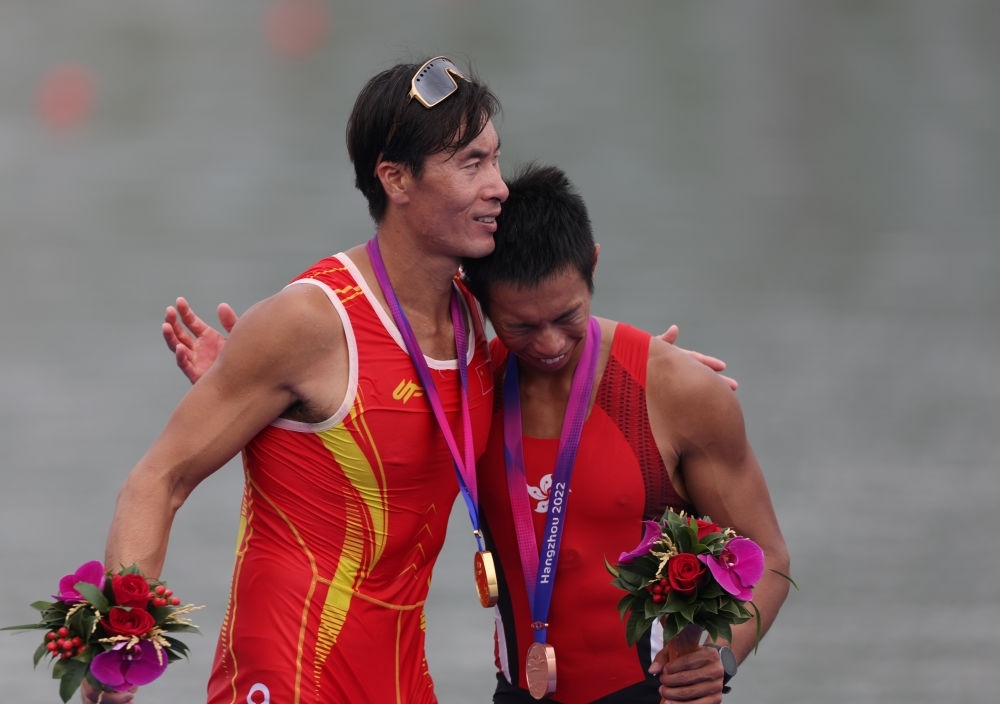 9月25日,冠軍中國選手張亮(左)與季軍中國香港選手趙顯臻在男子單人雙槳頒獎(jiǎng)儀式后擁抱致意。