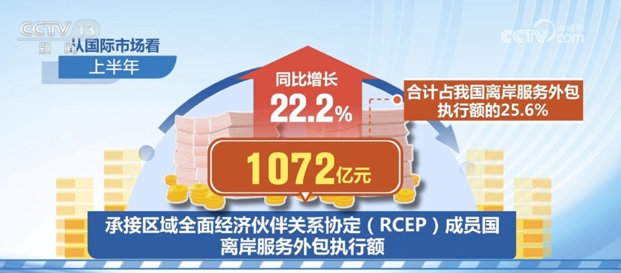 從國際市場看,上半年,承接區(qū)域全面經(jīng)濟伙伴關系協(xié)定(RCEP)成員國離岸服務外包執(zhí)行額1072億元,同比增長22.2%,合計占我國離岸服務外包執(zhí)行額的25.6%。