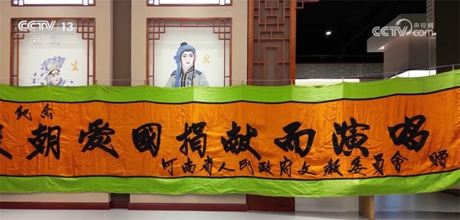 總臺記者 李恩浩:在河南省戲曲聲音博物館,有這樣一個十多米的條幅,上面寫著“為抗美援朝愛國捐獻(xiàn)而演唱”,這是香玉劇社義演的第一場,河南省人民政府特意為了支持他們的愛國行動贈送的,當(dāng)時香玉劇社在全國義演時它就掛在舞臺上方。