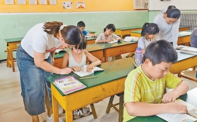 8月8日,河北省獻(xiàn)縣樂壽鎮(zhèn)東翟小學(xué)安置點內(nèi),學(xué)校老師為學(xué)生輔導(dǎo)功課。本報記者 邵玉姿攝