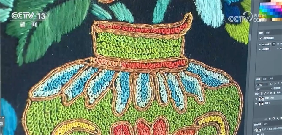 經(jīng)由高清設(shè)備采集、原樣分析、線圖提取,絲綢紋樣的圖案、色彩、針?lè)?、層?jí)都在電腦屏幕上一覽無(wú)遺。