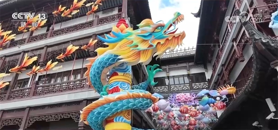 這幾天,南京路上各種龍?jiān)匮b置和商品將步行街裝飾一新;在南京西路商圈,這個造型裝置宛若一只巨龍騰空而起,頗有氣勢;在上海徐家匯、中山公園、前灘等商圈,各色龍?jiān)責(zé)艚M亮相;在龍華商圈,戲臺也演繹出龍的造型,大街小巷春節(jié)氛圍滿滿。