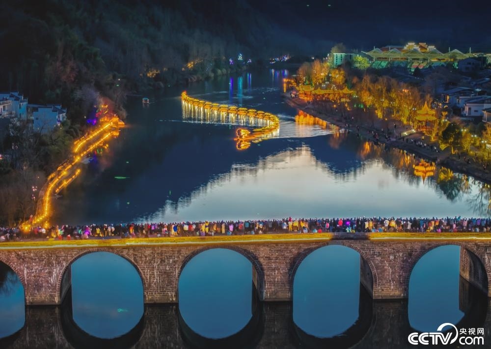 2024年2月12日,安徽黃山齊云山景區(qū),一條由幾十艘竹筏組成百米“金色巨龍”在橫江江面上游弋而過,構成一幅震撼的金龍巡游畫卷。