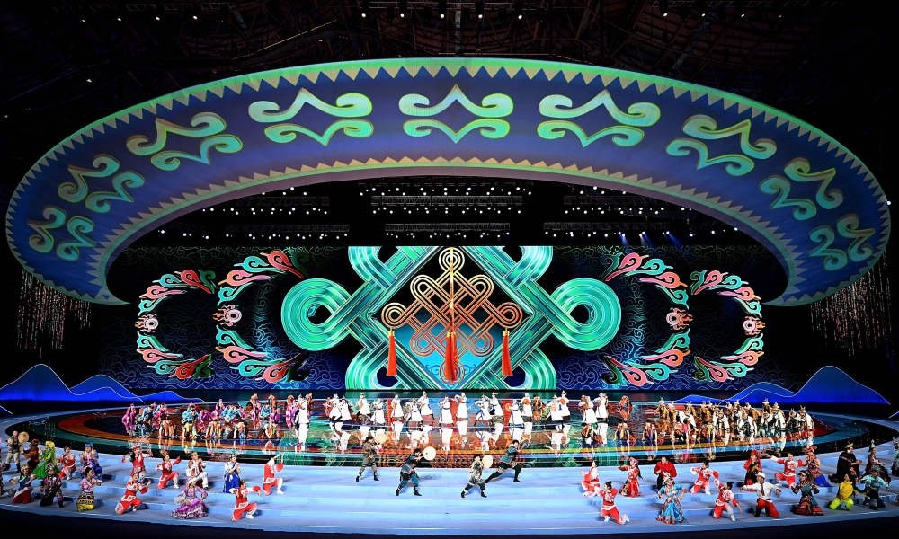 天津年畫、蘇州園林、福建土樓、西藏布達(dá)拉宮……在開幕式的代表團(tuán)入場環(huán)節(jié),各省區(qū)市的人文風(fēng)情和地標(biāo)元素通過剪紙、國潮風(fēng)彩繪等藝術(shù)風(fēng)格展現(xiàn),搭配著《鄂倫春小唱》《美麗的草原我的家》《駿馬奔馳保邊疆》等耳熟能詳?shù)膬?nèi)蒙古音樂,讓觀眾領(lǐng)略到中華民族輝煌璀璨的文化。