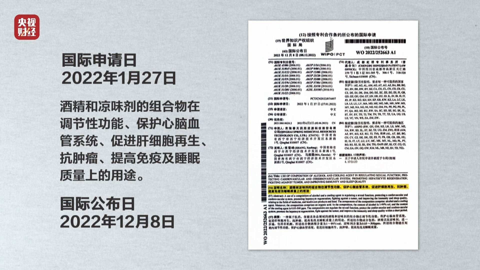 聽花酒申請的專利到底是什么?根據聽花酒公開資料顯示,2022年1月27日,聽花酒申請的國際專利,名稱為《酒精和涼味劑的組合物在調節(jié)性功能、保護心腦血管系統、促進肝細胞再生、抗腫瘤、提高免疫及睡眠質量上的用途》,公布日為2022年12月8日。