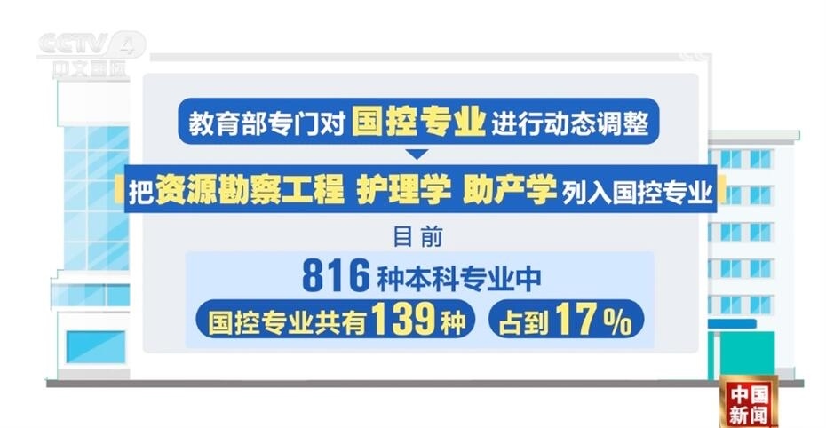 此次教育部專門對國控專業(yè)進(jìn)行了動(dòng)態(tài)調(diào)整,把資源勘察工程、護(hù)理學(xué)、助產(chǎn)學(xué)列入了國控專業(yè)。目前,816種本科專業(yè)中,國控專業(yè)共有139種,占到17%。未來,國控專業(yè)范圍還將進(jìn)行“有進(jìn)有出”的動(dòng)態(tài)調(diào)整。